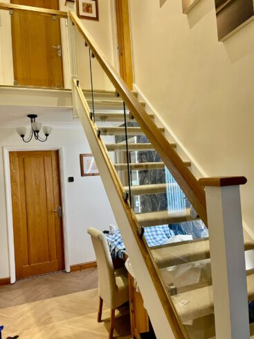Brief Remove existing spindles and wooden handrail with glass and a new wooden handrail. Result This project was completed in a period of 1 month. The existing wooden railings were removed and a new newel post was installed at the bottom. Then, the handrail was replaced with a new wooden handrail. Next the glass was templated to ensure it would be the correct fit. Finally the Clamps and glass were installed and any finishing touches were completed.