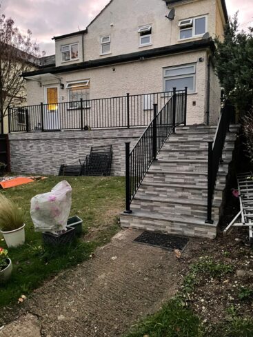 Brief Install a cost effective railing system that meets building regs. Result We installed the black railing system on a patio area and stair section. all the panels we cut to size on site and installed in 2 day. The Black Railing is the most cost effective way to meeting building regs in an external residential setting.